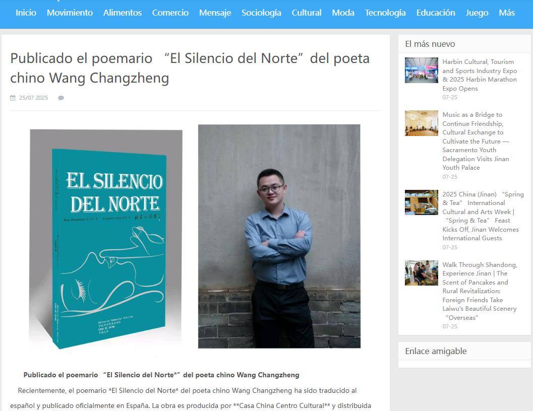 近日,西班牙最具影响力的文学媒体《文学世界》(El Mundo Literario)发布报道《中国诗人王长征诗集<北方的沉默>出版》,通过本书解读中国北方的诗意密码,聚焦中国诗人王长征双语诗集在西班牙的传播现象。这是继莫言、余华等作家之后,西语世界首次对中国诗人的系统性关注,标志着中西文学交流从经典小说向当代诗歌领域的纵深化延伸。