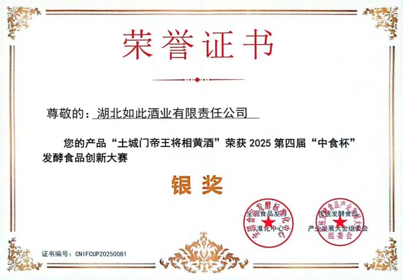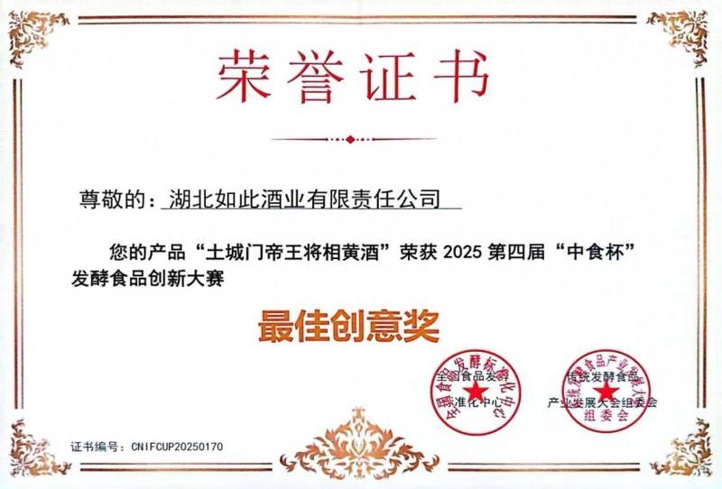 2025年10月11日晚上18:30,第四届“中食杯”发酵食品创新大赛颁奖典礼在四川省自贡市拉开帷幕,湖北如此酒业有限责任公司的产品“土城门帝王将相黄酒”分别荣获银奖和最佳创意奖两项大奖,格外引人注目。一款产品两个奖项,双重荣誉的加持,折射出品评专家团队的高度认可。