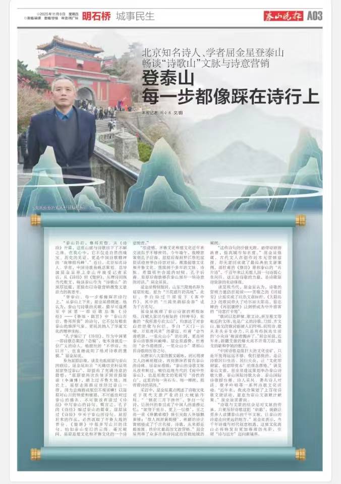 “中国诗歌是座巨大的文化金矿,只是开发得远远不够。我们要做的,是让诗歌回归生活、回归大众,让‘文化即财富,创意即资本’的理念落地。”谈及泰山文旅,屈金星建议充分利用深厚的诗歌传统,策划举办“泰山诗歌大赛”“泰山国际诗歌大会”“泰山国际诗歌擂台赛”、诗人采风、诗词名人NPC互动、著名诗人对话、歌手吟唱等一系列诗歌文化活动。“近年来,我成功策划上百项诗歌文旅活动,愿意为泰山文旅献计献策。我与山东有缘,儿子还在山大读书呢!”屈金星笑着说。