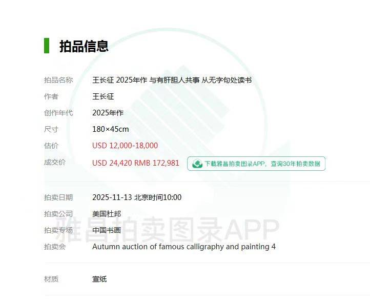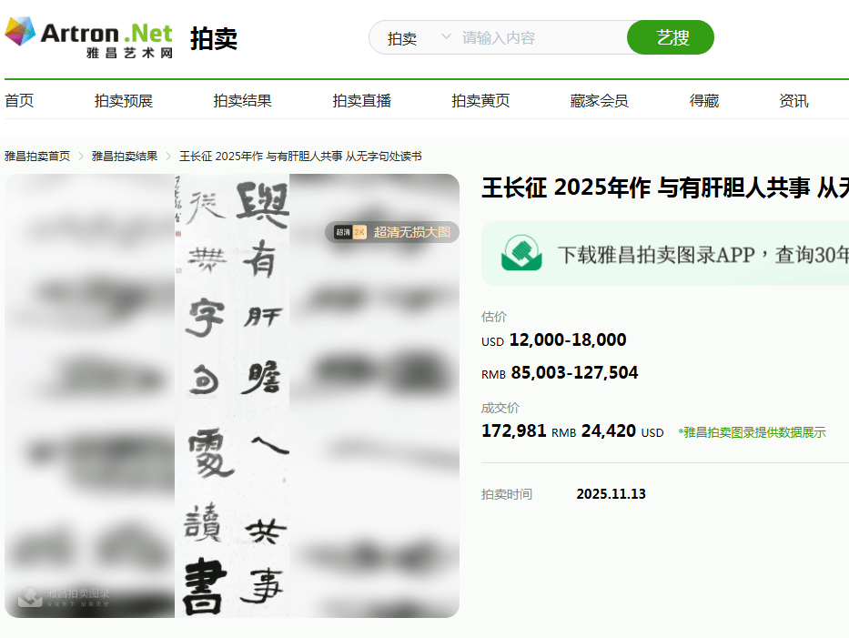 11月13日,在美国杜邦冬季拍卖会中国书画专场中,来自世界各地的收藏家与艺术界人士齐聚一堂,多件中国书画精品轮番竞拍。其中,中国艺术家王长征的书法作品《与有肝胆人共事,从无字句处读书》经过多轮激烈竞价,最终以24,420美元落槌,约合人民币172,980元成交,成为该场拍卖中备受瞩目的焦点。