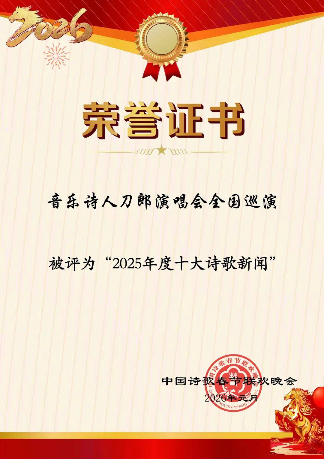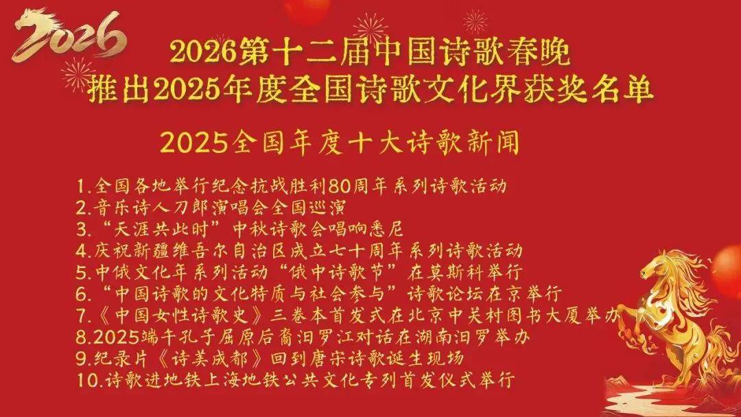 2026年2月9日,2026第十二届中国诗歌春晚正式发布2025年度全国诗歌文化界获奖名单,重磅揭晓2025年度全国十大诗歌新闻。其中,音乐诗人刀郎演唱会全国巡演荣登榜单第二名,消息一经发布,迅速在抖音、视频号、小红书等社交平台刷屏,形成现象级文化热点。