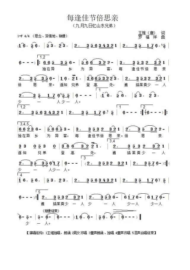 罗福祥听了大家的议论,再细细品味王维的经典名作《九月九日忆山东兄弟》,作为一名军旅培养出来的词曲作者,我当时就情不自禁地开始酝酿,随即,一首古诗词的旋律在脑海中形成,返回宾馆后我就记录下来了词谱。他给诗人们一试唱,受到大家的一致好评。回到家后,再经过几天的琢磨,一首《每逢佳节倍思亲》的古韵风格的歌曲已基本定稿。