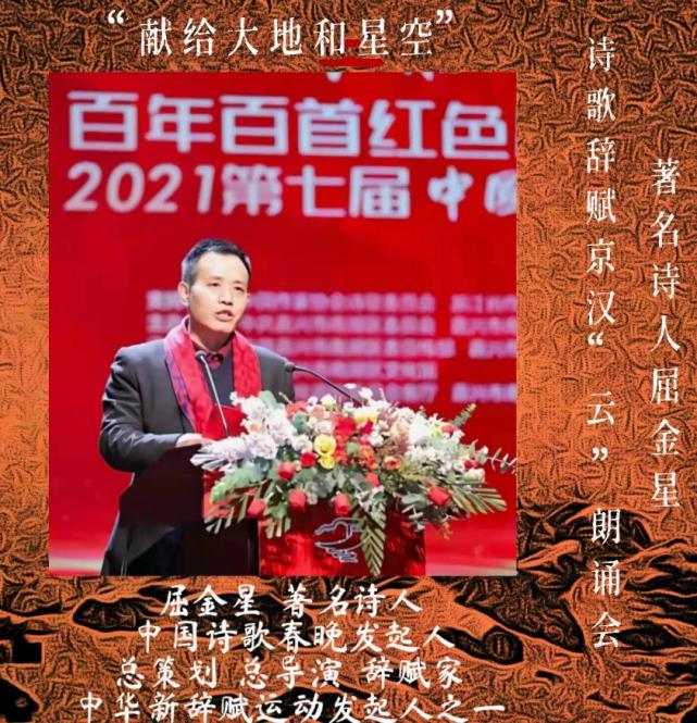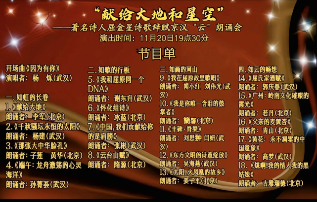据悉,由湖北省朗诵艺术家协会会长、湖北省广播电视台播音指导谢东升和中国十大诵读艺术家、国家一级演员、湖北省朗诵艺术家协会常务副会长杨建领衔的北京、武汉22位朗诵艺术家精彩演绎屈金星的18首诗歌辞赋作品。诗会分为:《如虹的长卷》《如歌的行板》《如画的河山》《如云的畅想》等四个篇章。