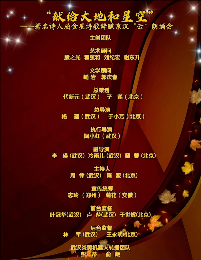 本次活动由中国诗歌春晚组委会担纲顾问单位;武汉炎黄旅游文化促进会、湖北省朗诵艺术家协会、武汉炎黄朗诵艺术团、北京杏林朗诵艺术团主办;江城朗读者、杨建艺术工作室、北京新生代朗诵团、雨音潭艺术频道协办。(王长征、周步、于小芳)