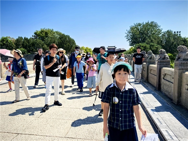 卢沟桥畔,勾超老师引导小读者观察不同石狮的姿态,五百多只石狮在栏板间各显神态,或怒目、或嬉戏,像一支凝固的仪仗队。勾老师带领着孩子们从石狮的卷鬃讲到云纹须弥座,再讲到桥孔分水尖的“斩凌剑”如何劈开永定河千年冰凌;从“卢沟晓月”碑亭讲到乾隆御笔,再讲到七七事变的那声枪响……书本上的故事瞬间变得可触可感。