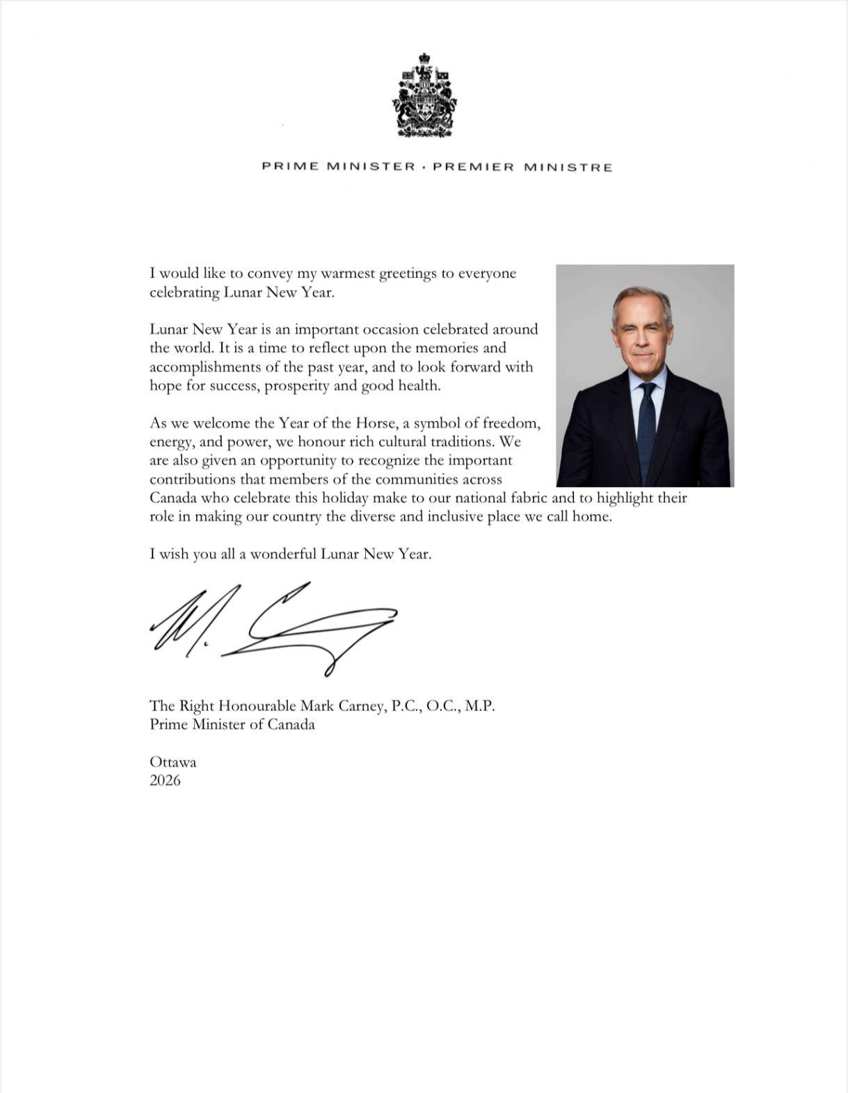 本届盛会收到了来自加拿大总理马克•卡尼和中国驻加拿大大使馆王镝大使的贺信与祝福。参议员布莱恩•弗朗西斯(Senator Brian Francis),前参议员胡子修(Victor Oh)也致电祝贺。