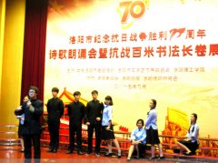 纪念抗战胜利 70 周年诗歌朗诵会暨抗战百米书法在洛阳理工学院举行 洛阳市纪念抗战胜利 70 周年诗歌朗诵会暨抗战百米书法长卷展示活动于 9 月 26 日上午在洛阳理工学院王城校区举行 . 著名诗人屈金星应邀观看演出 . 洛阳市委宣传部长杨炳旭出席朗诵会。参演...