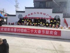 1月18日上午,界首市光武镇新杨寨村群众文化广场,锣鼓喧天,彩旗飘扬,高高挂起一个个象征吉祥如意、幸福安康的大红灯笼,到处洋溢着浓浓的年味。 该村迎新春,贺佳作文艺联欢会在这里隆重而热闹地举行,一时吸引几百名村民前来观看。 该村春节联欢会在一阵...